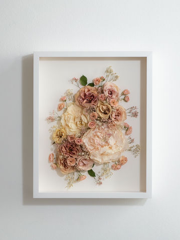 Nach dem Trocknungsprozess werden die Blüten, Gräser und Blätter deines Brautstraußes oder deiner Blumendekoration in einem Objektrahmen deiner Wahl arrangiert.